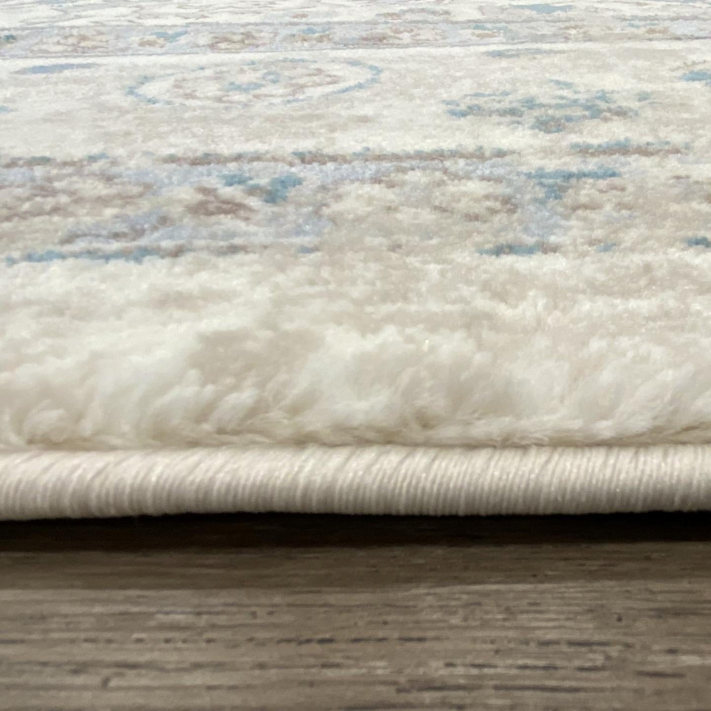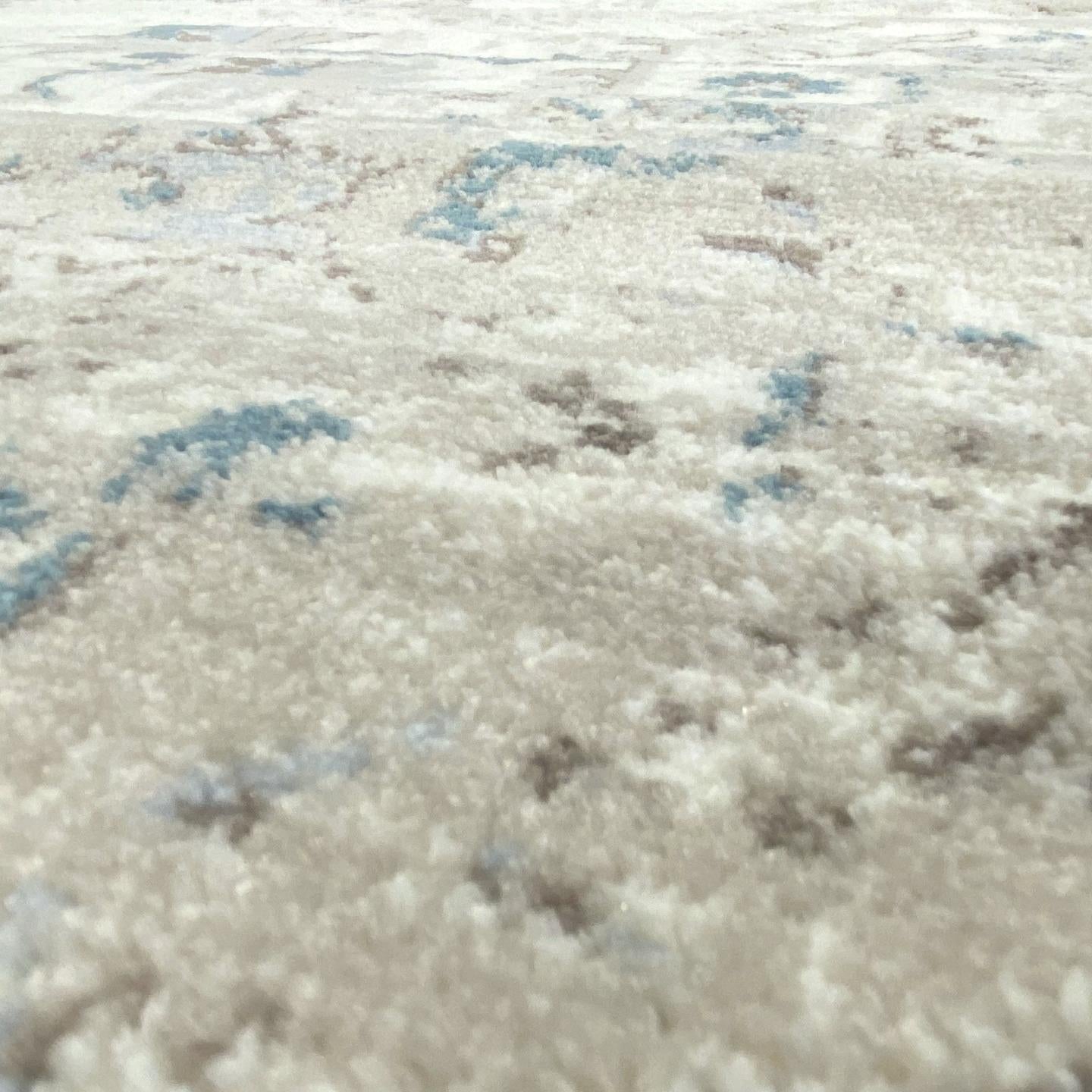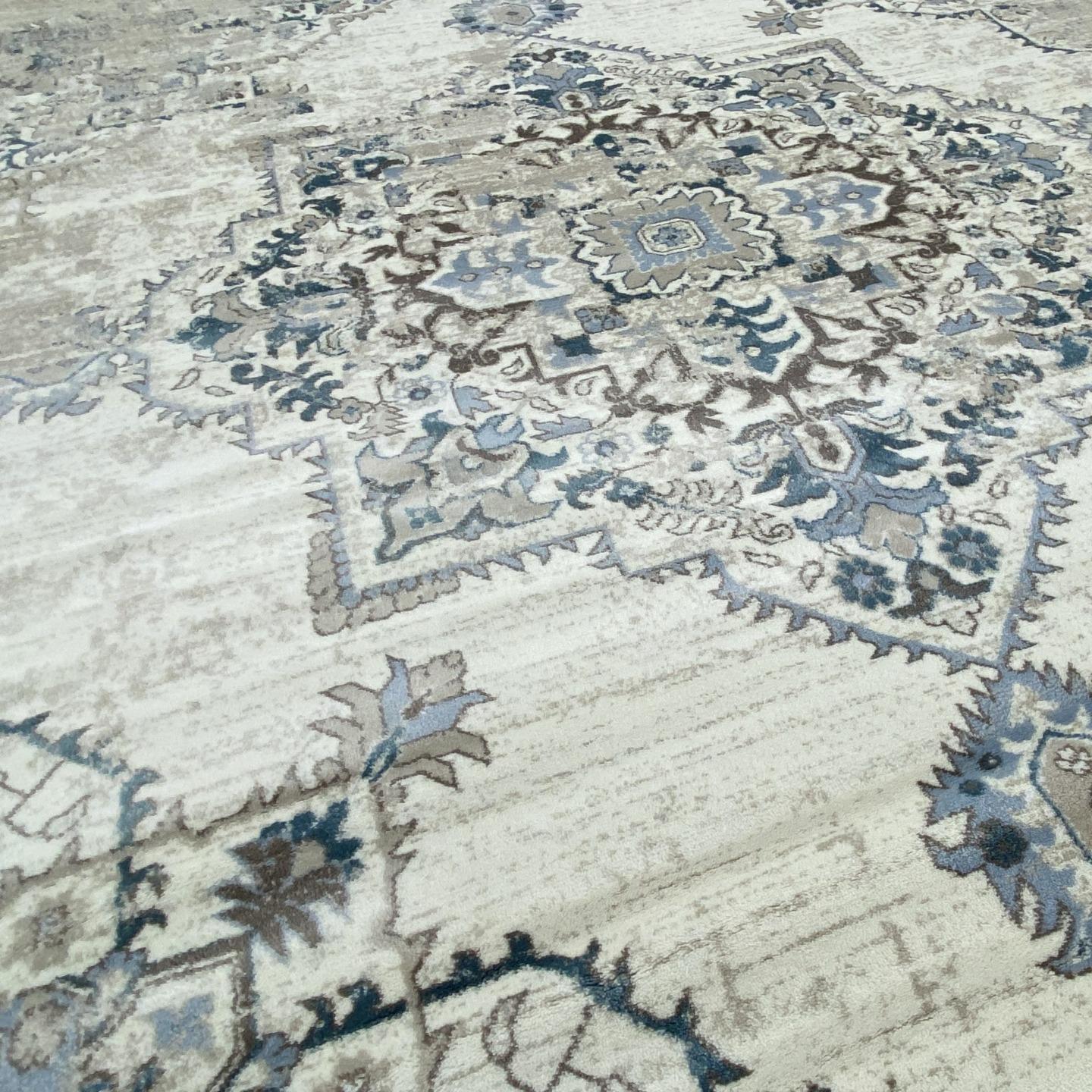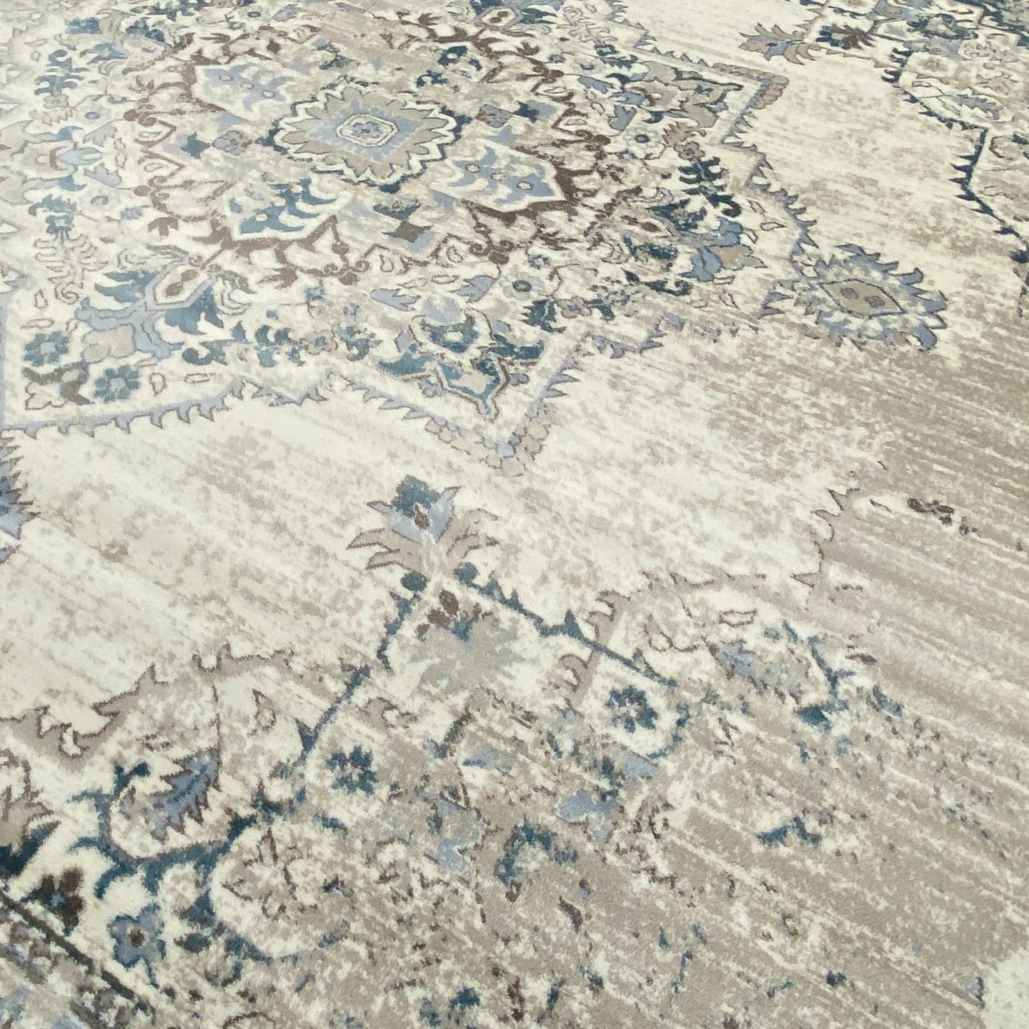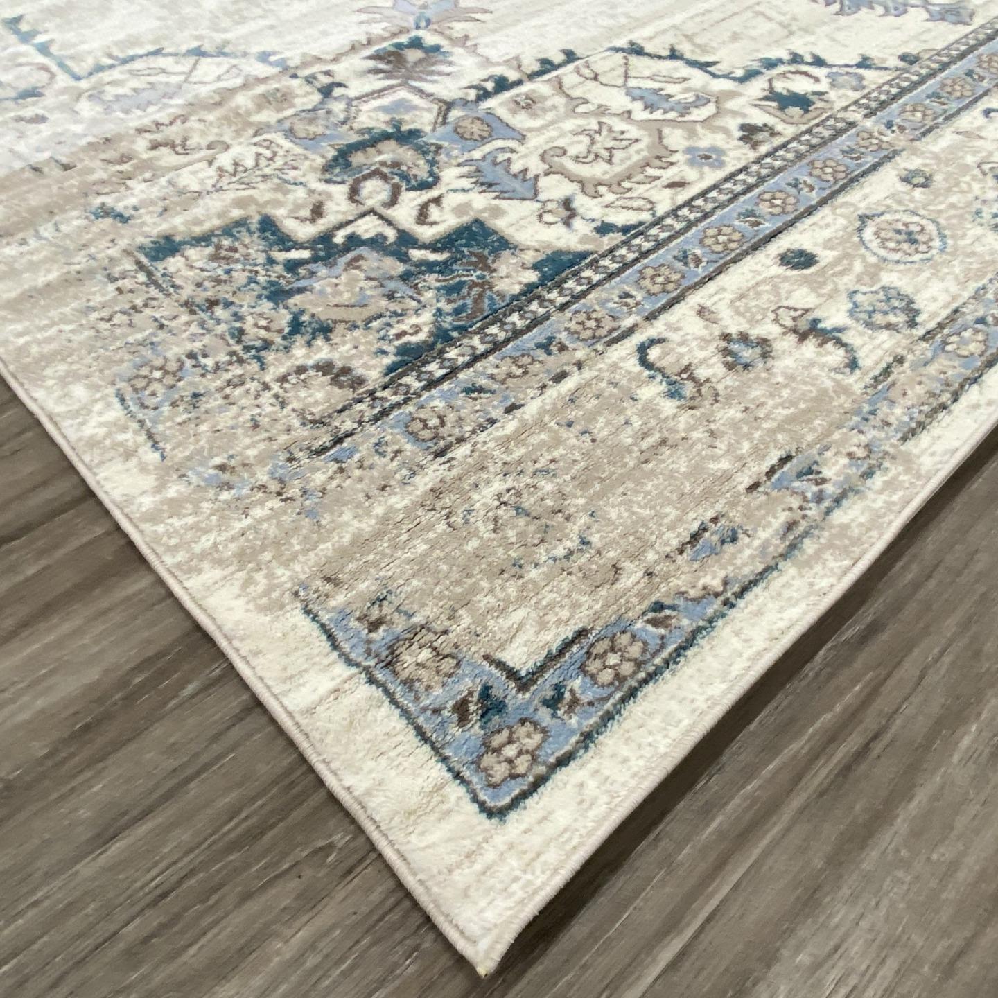 - Cream 8x10 rug with blue, brown and gray accent colors.